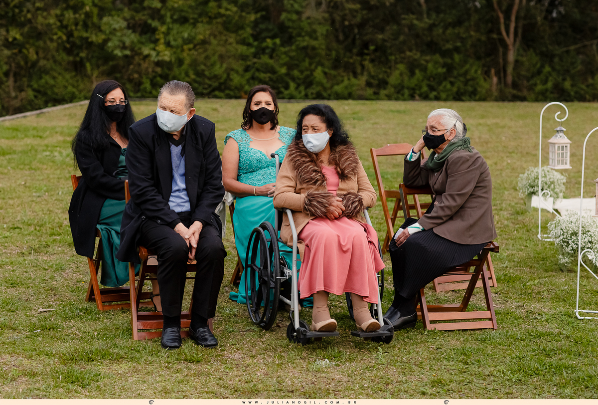 Apesar de ser uma cerimônia pequena e contida, os noivos puderam viver o momento do casamento em um ambiente aberto, com direito a transmissão ao vivo com uma equipe de Ponta Grossa - PR para mais de 2 mil pessoas! Os poucos convidados que puderam participar de forma mais intensa, isto é, sentados próximos da cerimônia, estavam devidamente protegidos por máscaras e usando álcool em gel. Os demais espectadores presentes participaram assistindo a cerimônia de dentro de seus próprios carros.