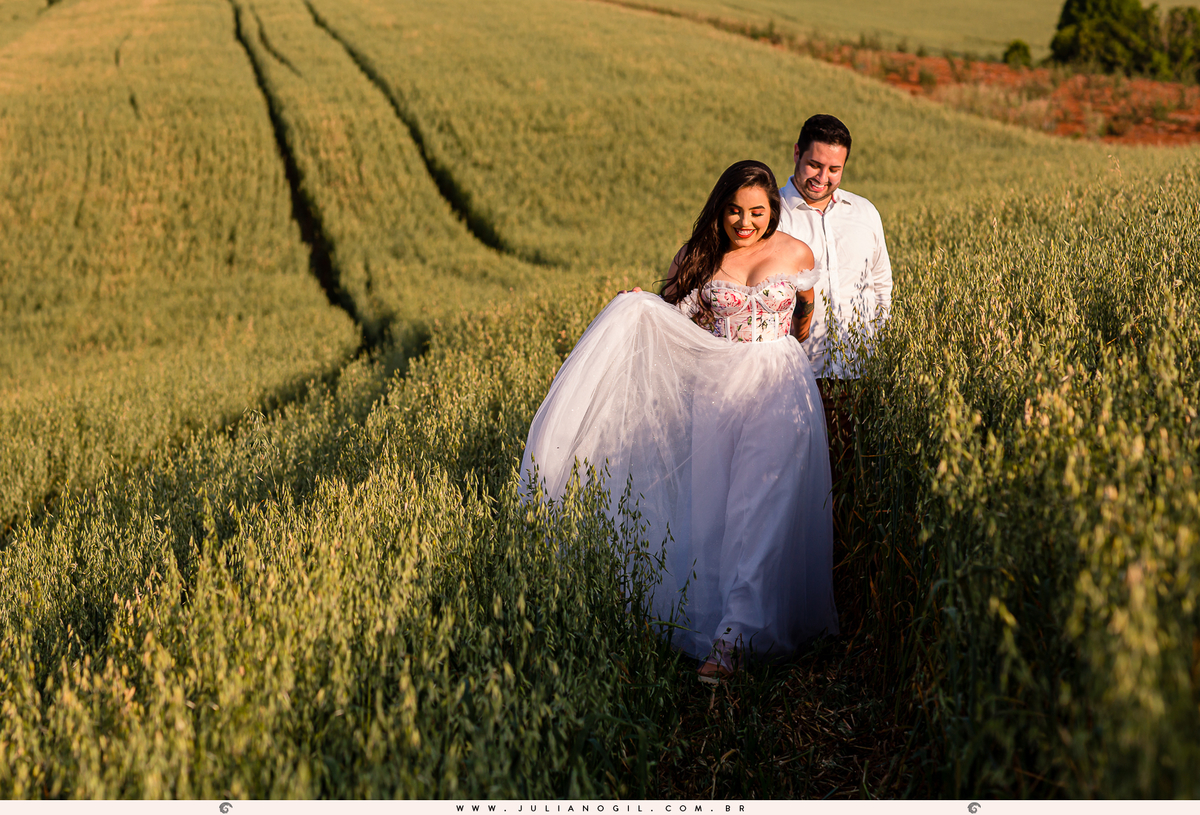 Bem próximo de onde estávamos havia uma plantação de trigo (da qual desconhecíamos o dono), invadimos e ali foi o momento para usar o vestido! O branco se destacou em meio ao amarelo envelhecido do trigo.