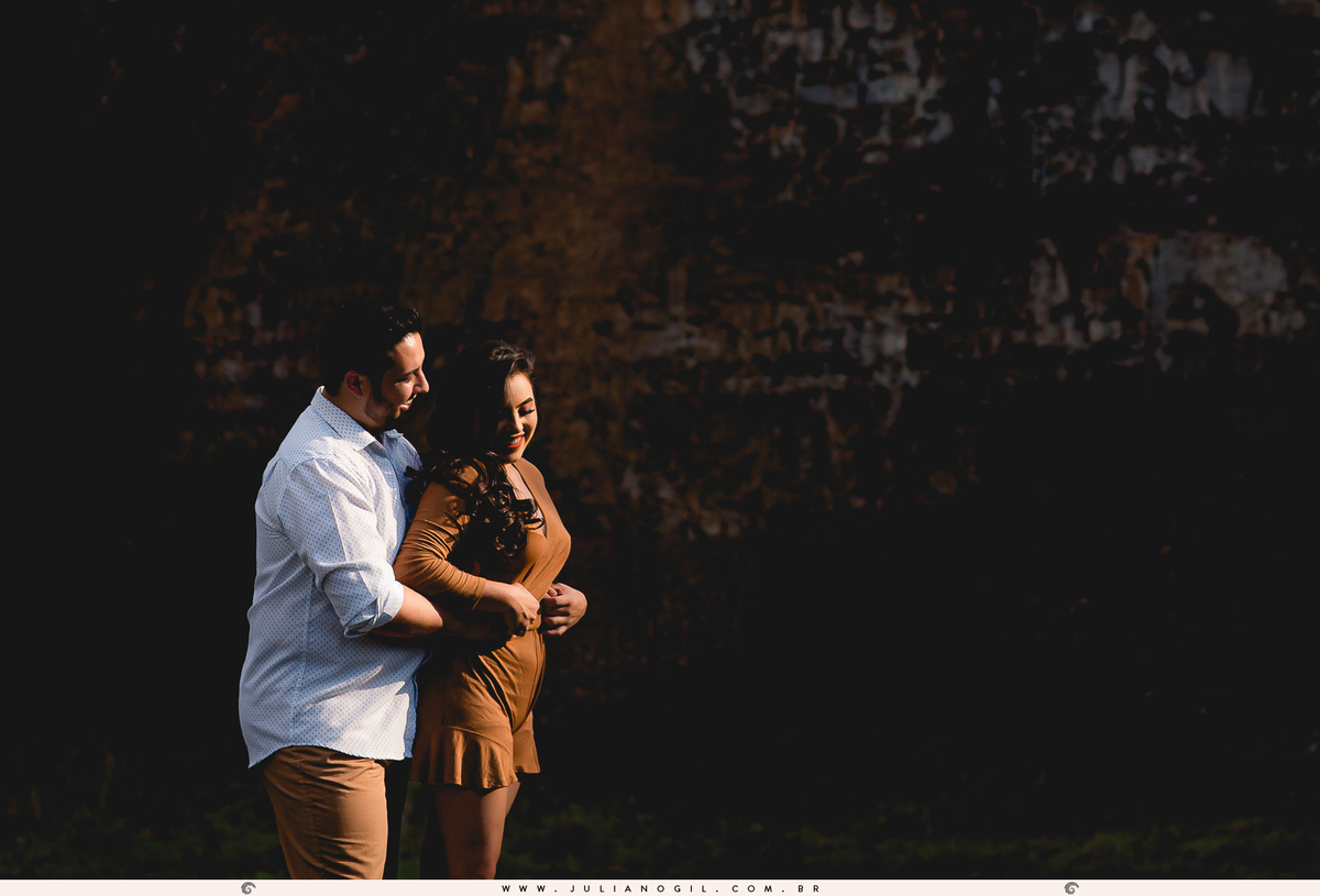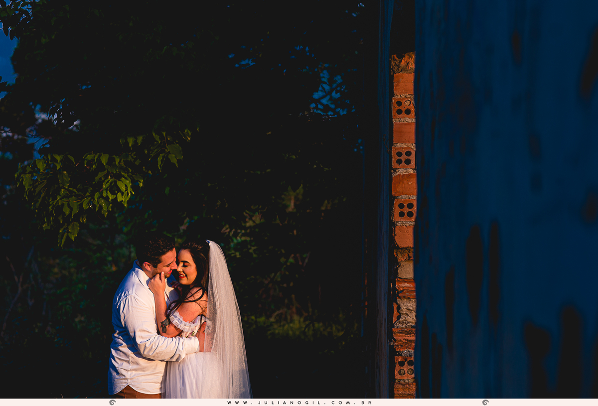 Mas aquele vestido merecia ainda mais! E para registrar mais momentos do casal Taís e Filipe optaram por fotos em uma construção abandonada. Num finalzinho de tarde, com o sol se pondo, aproveitamos as ruínas para fotos com jogos de luzes que destacavam o casal em meio a arbustos e paredes.